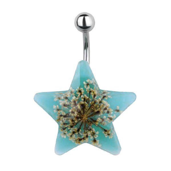 Star Shape Belly Ring with Dried Floral Burst in a Diamond Cut Resin Overlay.