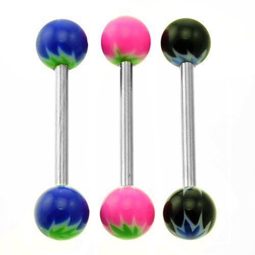 This straight Barbell with Pot Leaf design comes in 3 Color options, Blue, Black and Pink. The post of the Barbell is 1.6mm or 14GA x 16mmm long x 6mm Ball