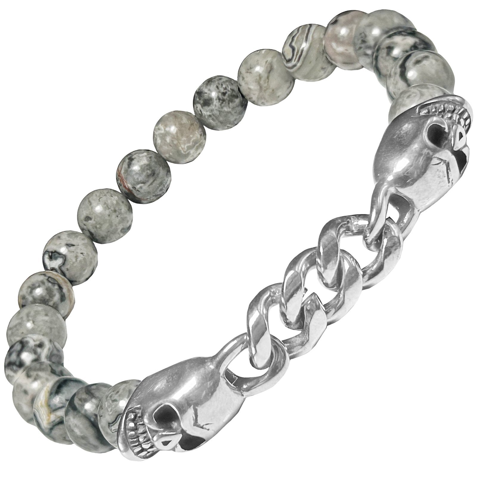 Stretch St. Steel Bracelet w/ Grey Marble Bead & Skull Accent