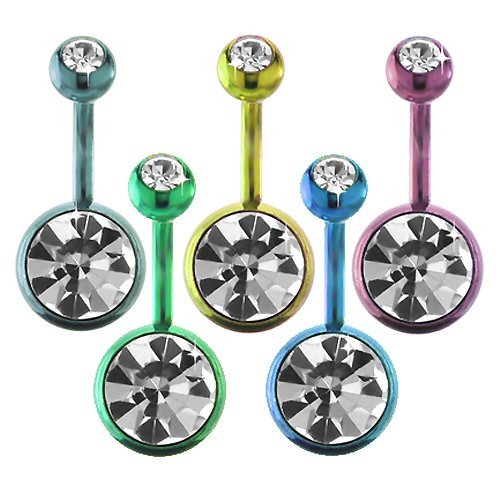 Anodized double gem belly ring in Stainless Steel. The navel rings come in a variety of Colors. This Navel Ring bottom stone is 10mm and top is 5mm.