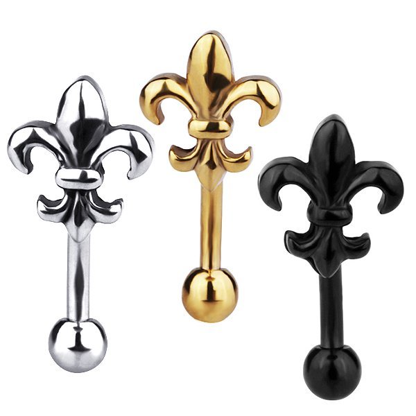 PVD Coated Three Dimensional Fleur De Lis Eyebrow Ring. This Item Comes in Steel, Black PVD and Gold PVD.