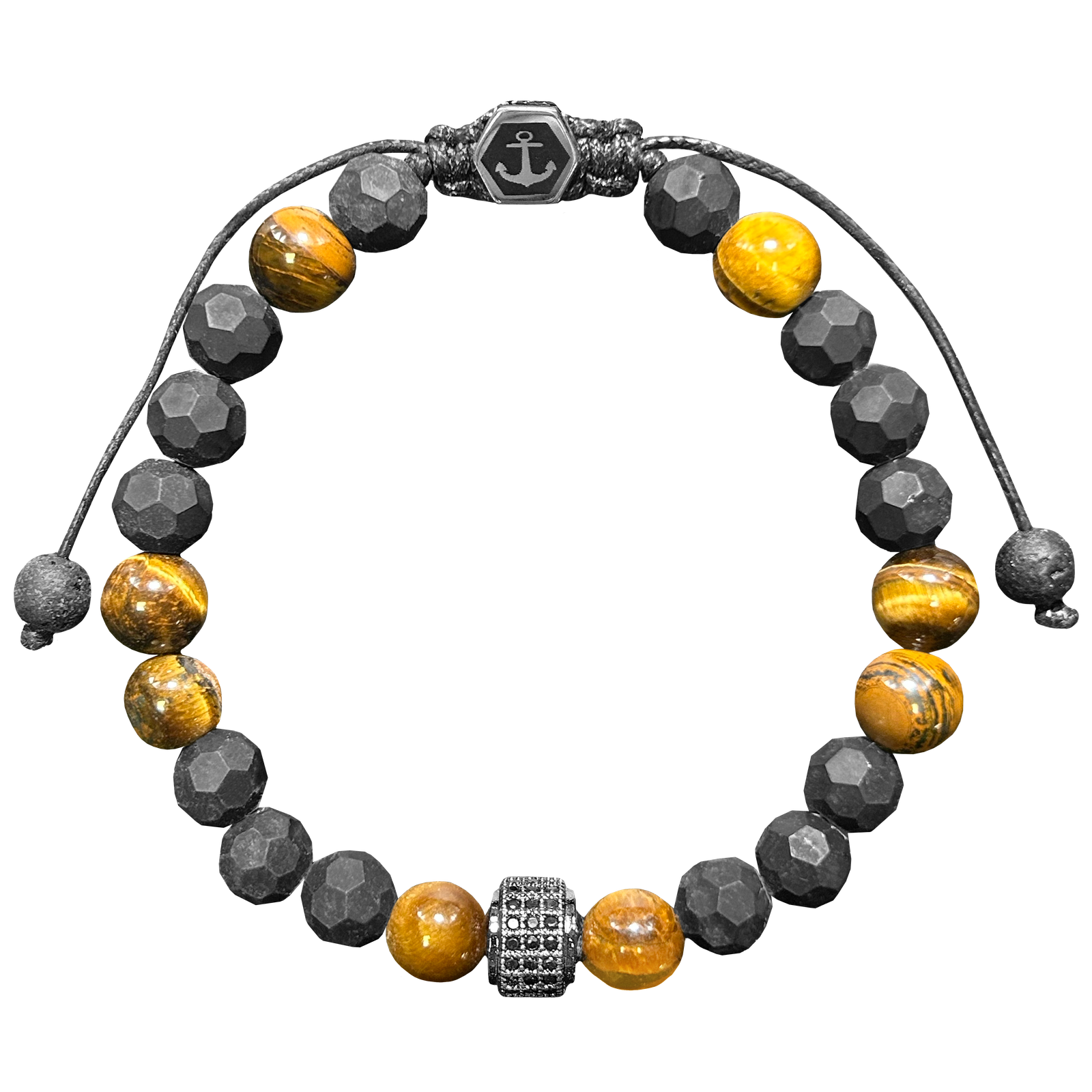 Tiger Eye & Black Beaded Bracelet w/ Anchor & CZ Beads
