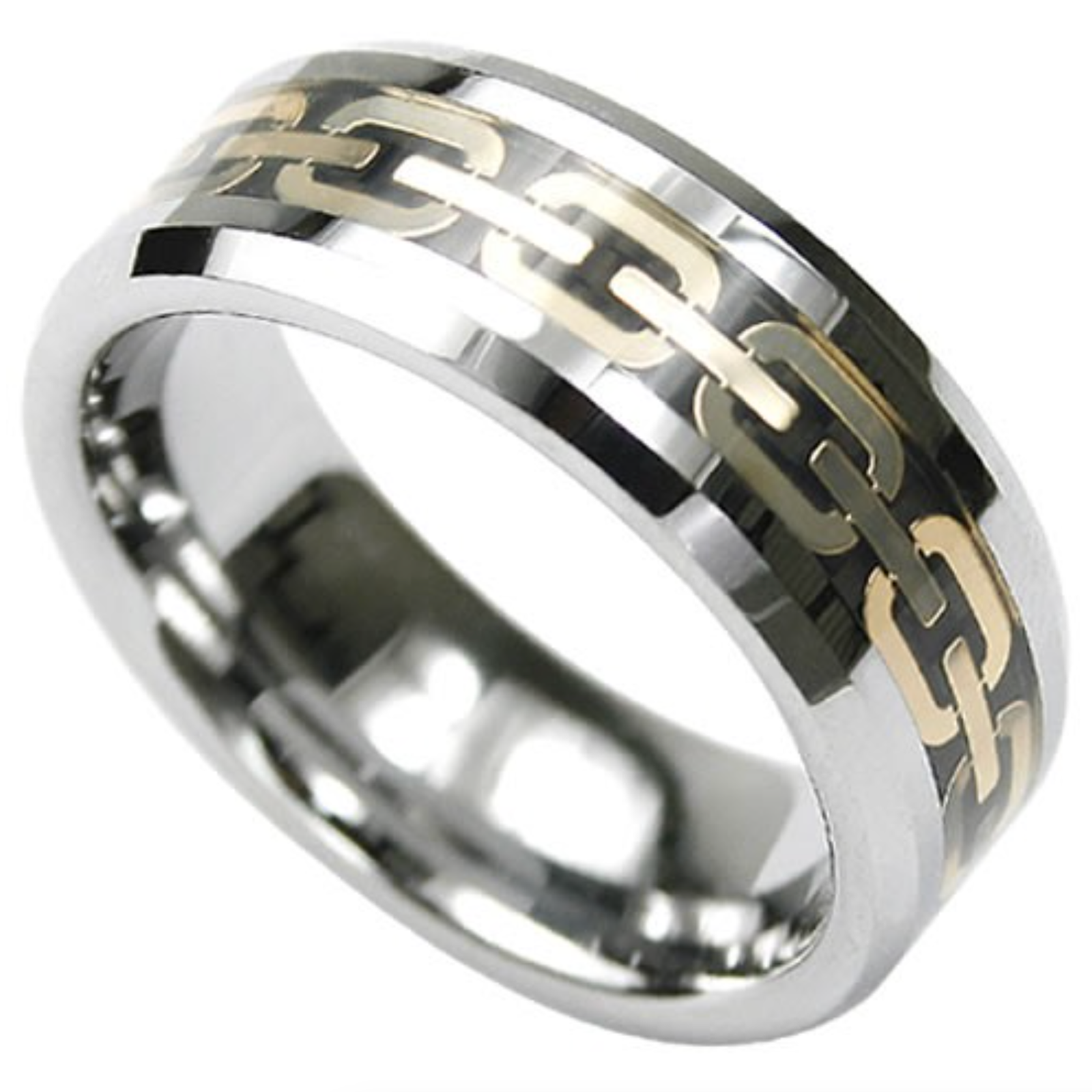 Tungsten Ring With Gold Chain Design In The Center And Clear Epoxy Overlay.