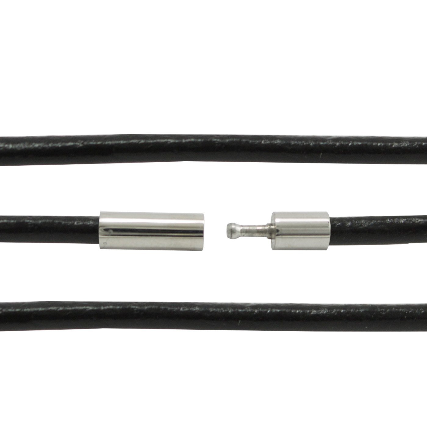 This is a Leather cord with a Stainless Steel Hybrid Mystery/Bayonet Lock for superior security. The cord can be used with any pendant that posses a bail that can accommodate 3mm thick chains. The cord itself is 3mm thick and 18″ inches long.